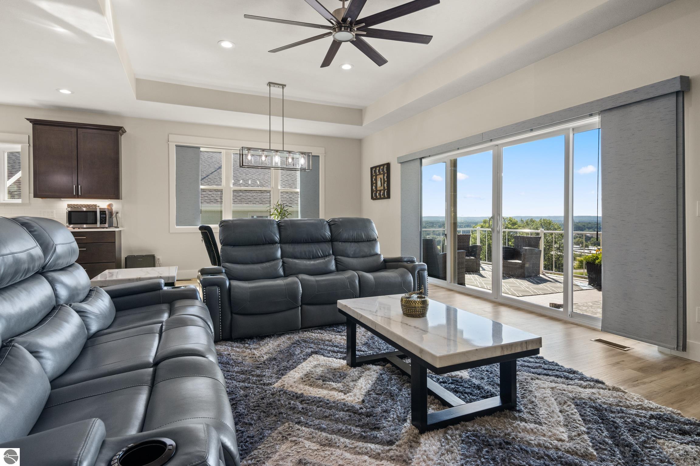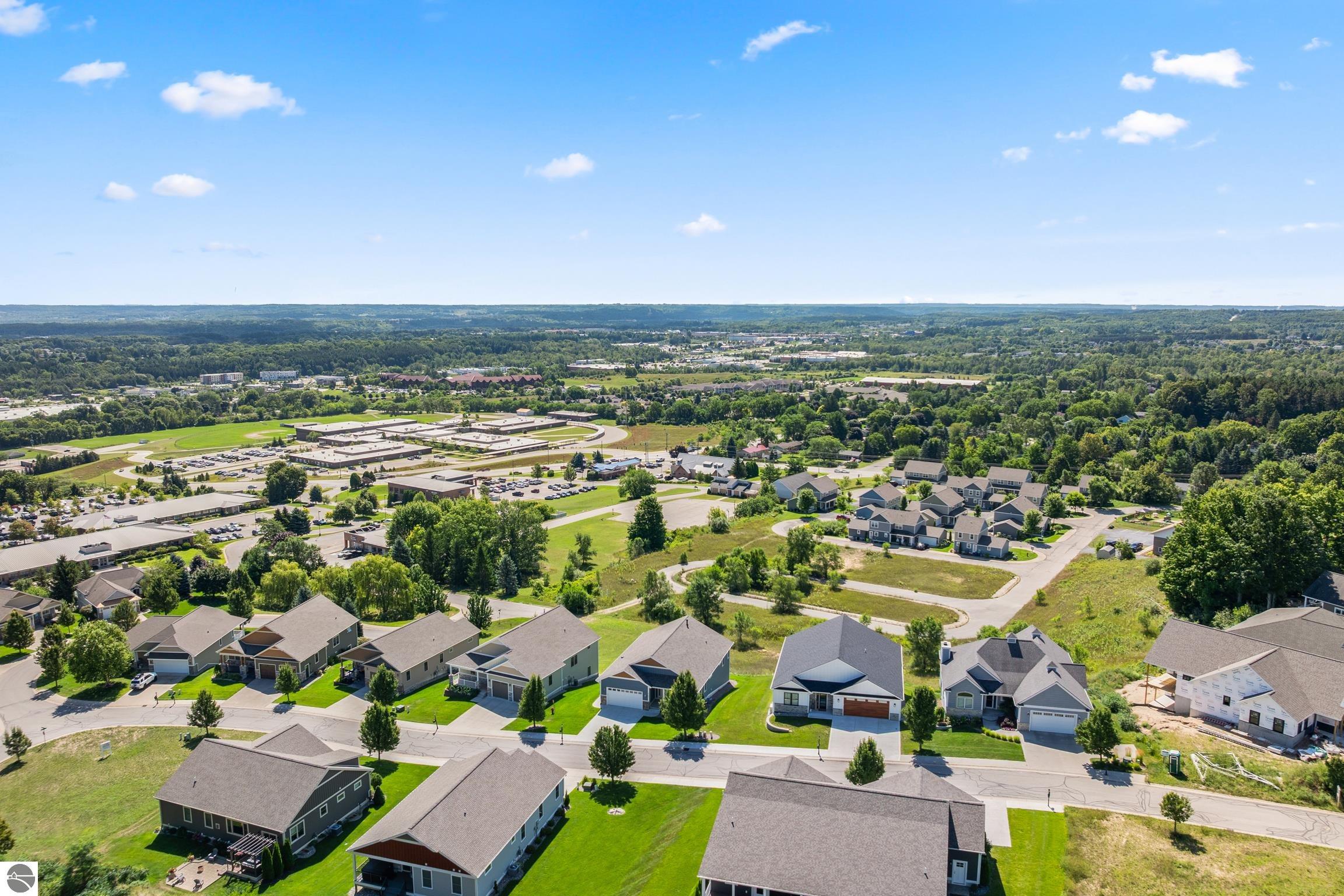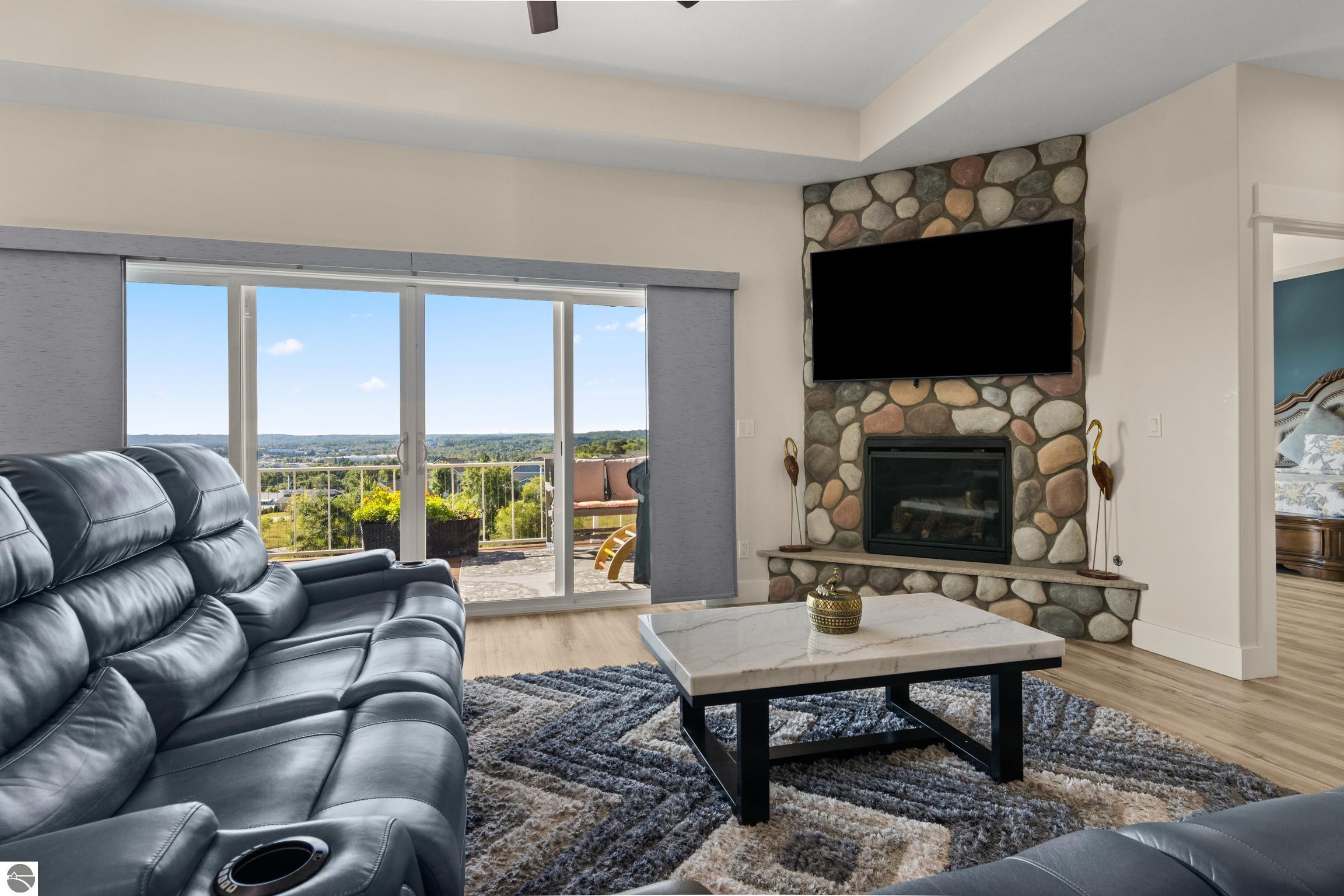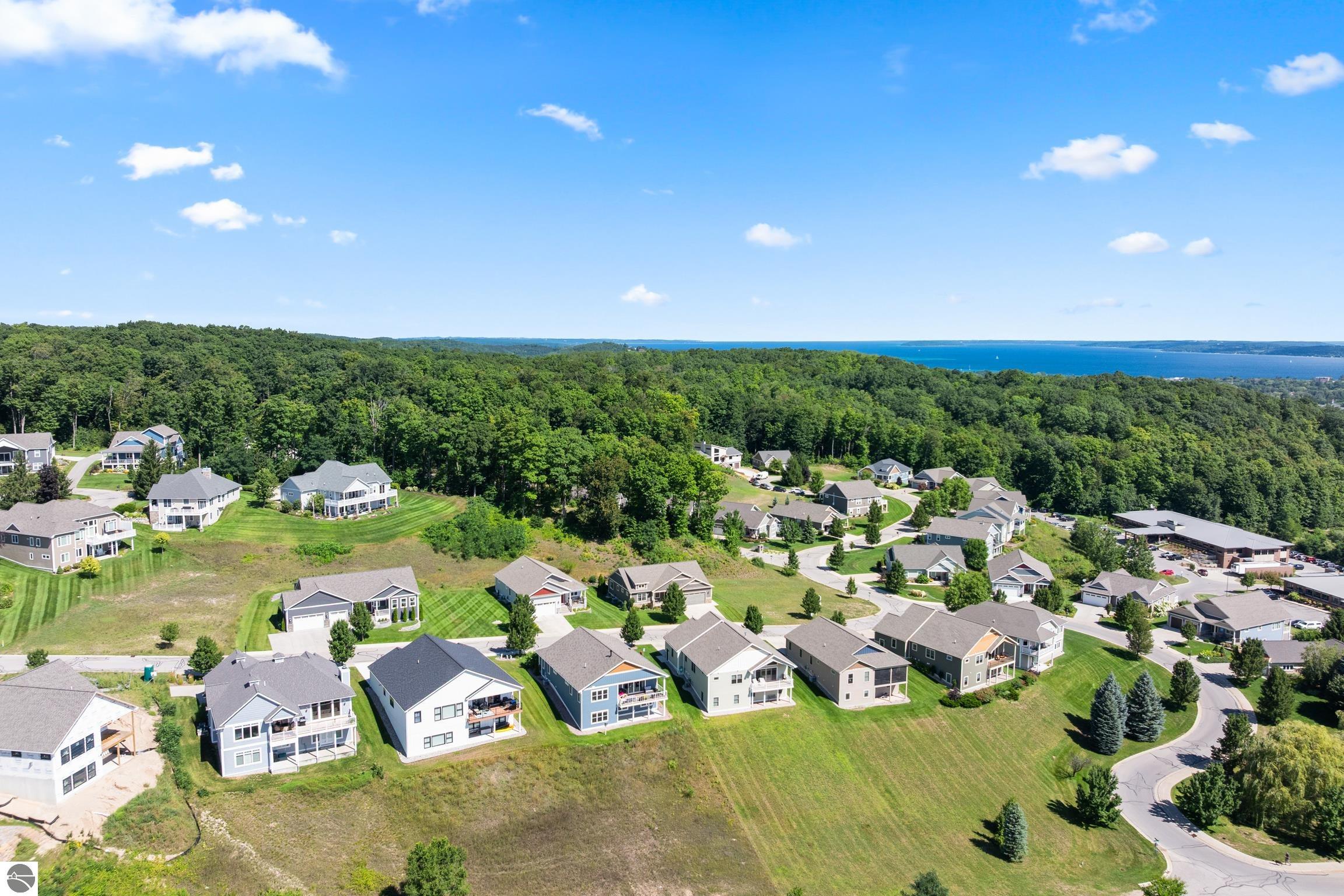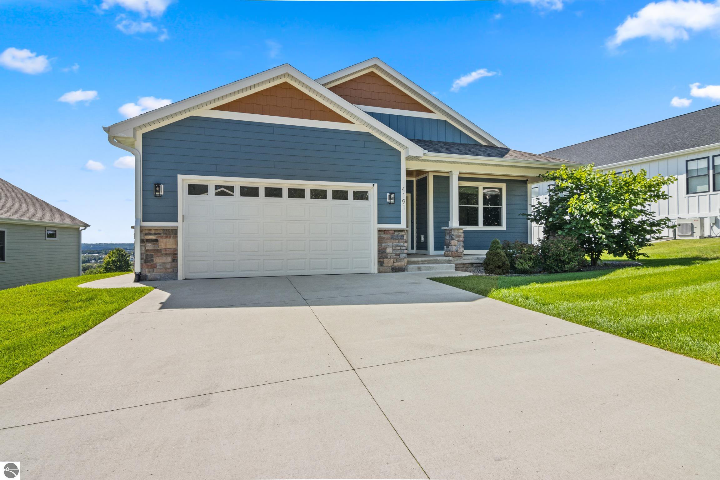 Welcome to Eagles View -- One of Traverse City's Premier Communities! This like-new, one-owner custom-built home offers the perfect blend of style, comfort, and functionality in one of Traverse City's most desirable developments. Its sweeping views make a stunning, picturesque backdrop. Thoughtfully designed with attention to detail throughout, this residence provides the ease of main-floor living in an open and inviting layout. The spacious primary suite features a private bath and a walk-in closet. The primary bedroom has a trayed ceiling to add to the luxurious look. The bright and modern kitchen is equipped with granite countertops, stainless steel appliances, a large island, a pantry, and extra shelving. The living and dining areas showcase a trayed ceiling, a stunning stone-surround gas fireplace, and double...yes, double sliding doors that open to a private rear patio -- perfect for relaxing or entertaining. Luxury vinyl plank flooring runs through the main living areas, and the home includes central air conditioning for year-round comfort. All of the bathrooms have tile flooring. The main floor also offers a convenient laundry room just off the attached two-car finished garage. The finished lower-level walk-out includes two additional bedrooms, a full bathroom, a spacious family room, a recreational area, and ample storage space. Professionally landscaped by Living Art Landscapes, the yard is equipped with irrigation and provides a serene outdoor oasis. This home is ideally located just minutes from downtown Traverse City, Munson Medical Center, shopping, schools, and numerous hiking and biking trails.
