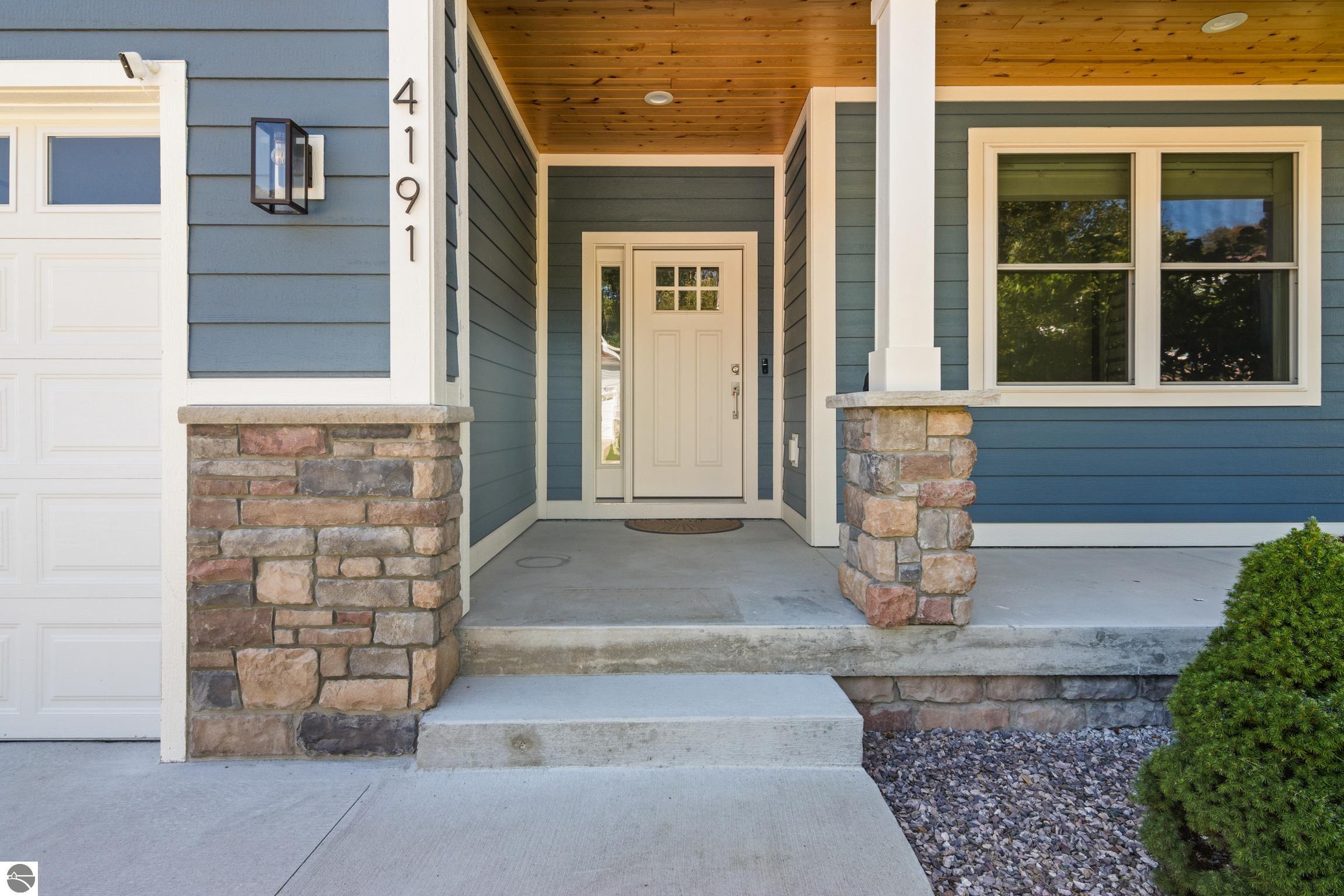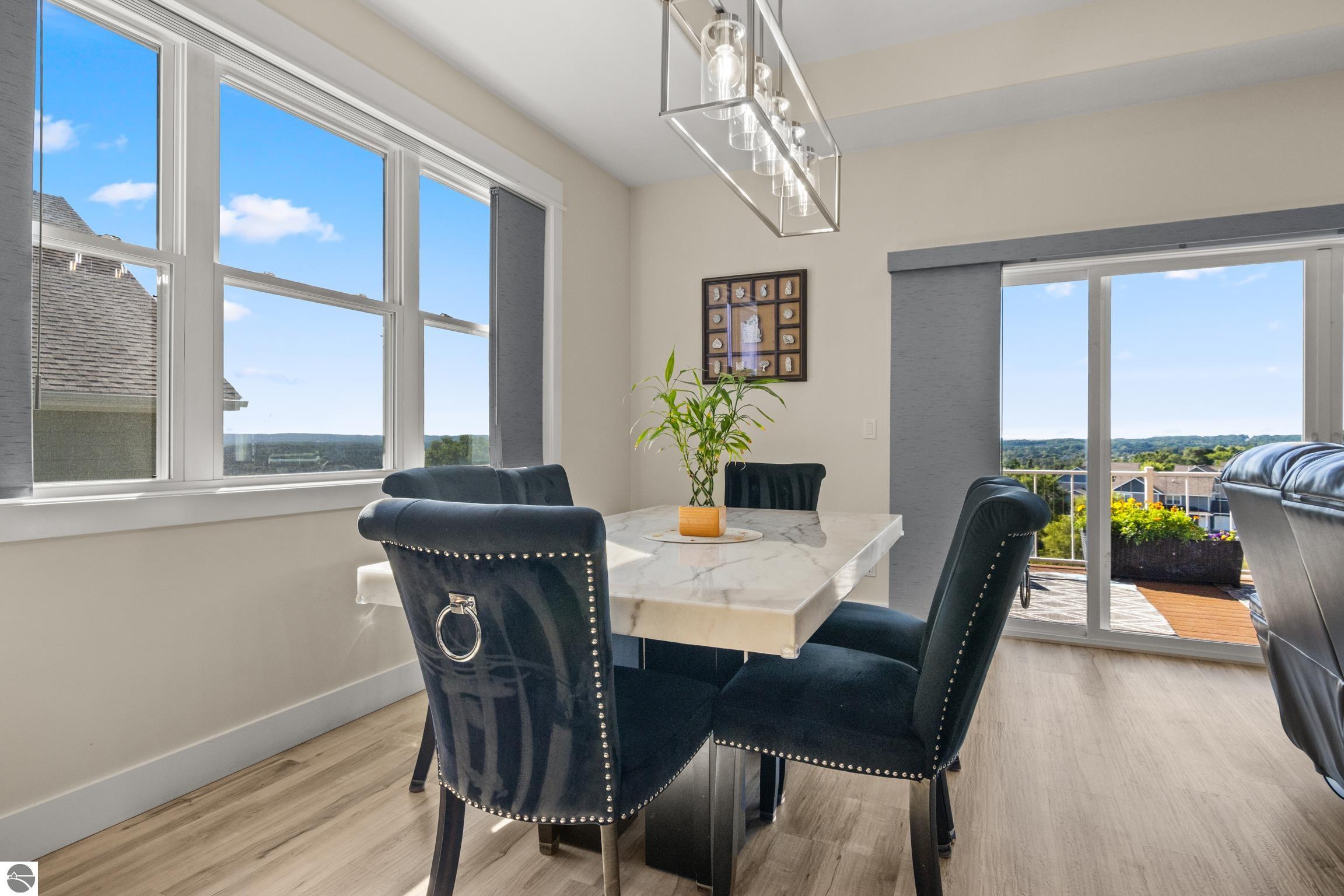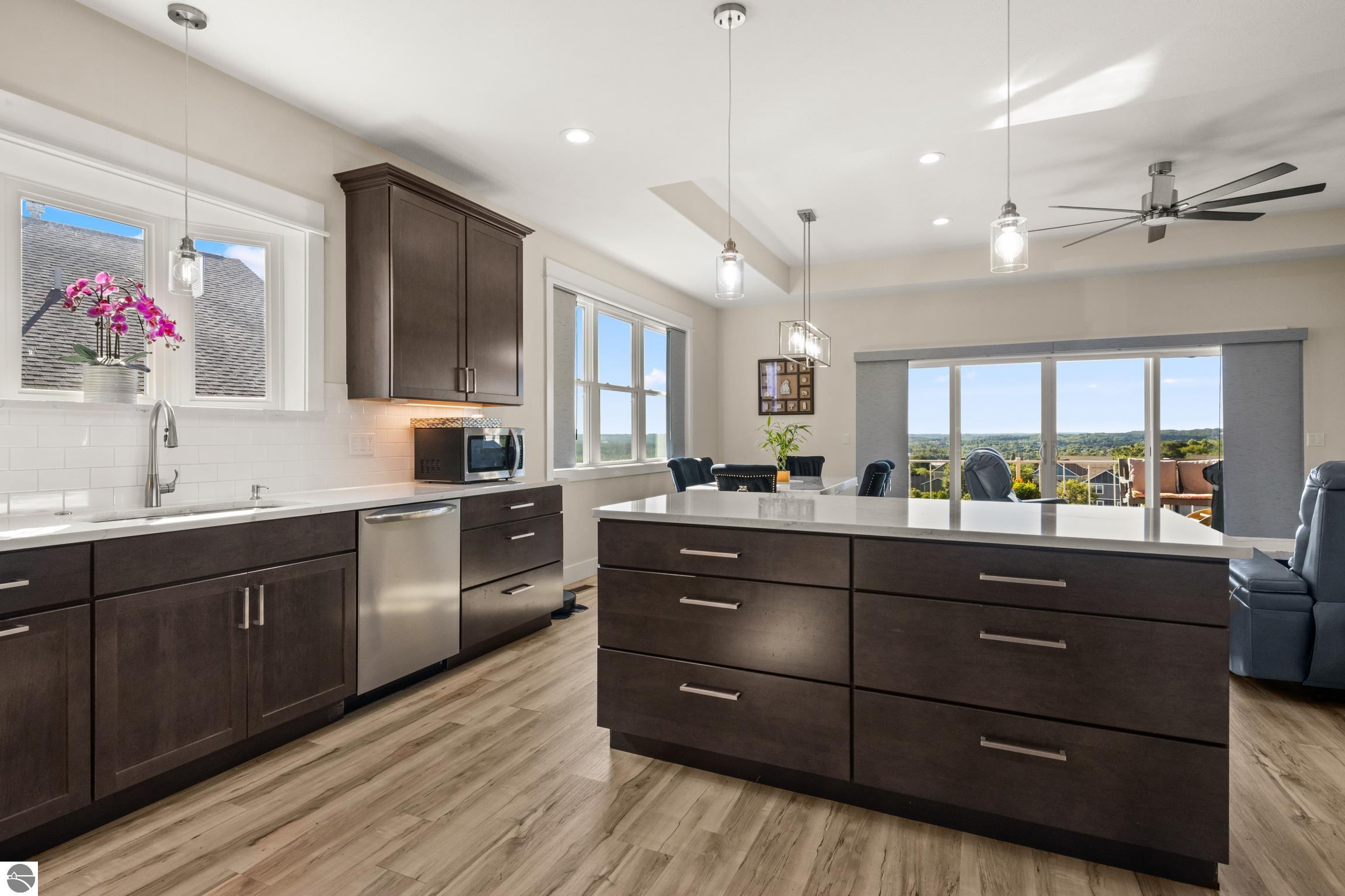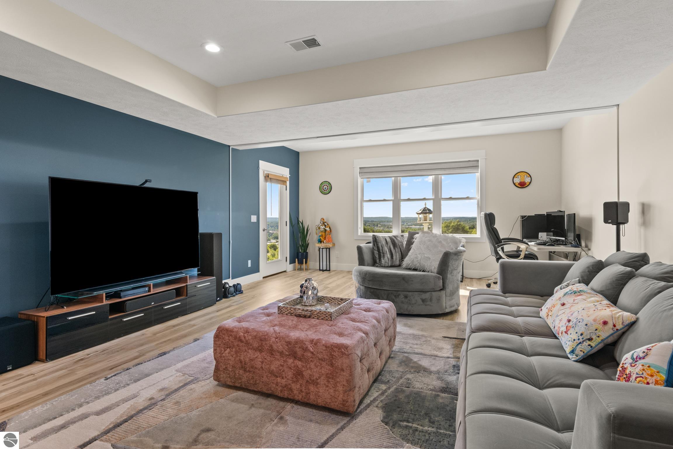 Welcome to Eagles View -- One of Traverse City's Premier Communities! This like-new, one-owner custom-built home offers the perfect blend of style, comfort, and functionality in one of Traverse City's most desirable developments. Its sweeping views make a stunning, picturesque backdrop. Thoughtfully designed with attention to detail throughout, this residence provides the ease of main-floor living in an open and inviting layout. The spacious primary suite features a private bath and a walk-in closet. The primary bedroom has a trayed ceiling to add to the luxurious look. The bright and modern kitchen is equipped with granite countertops, stainless steel appliances, a large island, a pantry, and extra shelving. The living and dining areas showcase a trayed ceiling, a stunning stone-surround gas fireplace, and double...yes, double sliding doors that open to a private rear patio -- perfect for relaxing or entertaining. Luxury vinyl plank flooring runs through the main living areas, and the home includes central air conditioning for year-round comfort. All of the bathrooms have tile flooring. The main floor also offers a convenient laundry room just off the attached two-car finished garage. The finished lower-level walk-out includes two additional bedrooms, a full bathroom, a spacious family room, a recreational area, and ample storage space. Professionally landscaped by Living Art Landscapes, the yard is equipped with irrigation and provides a serene outdoor oasis. This home is ideally located just minutes from downtown Traverse City, Munson Medical Center, shopping, schools, and numerous hiking and biking trails.