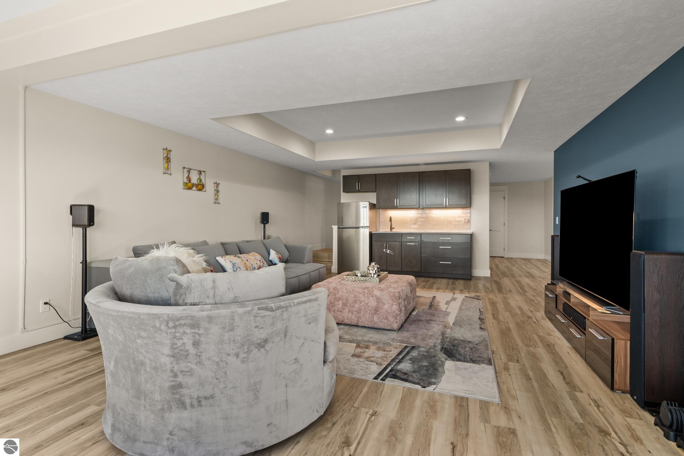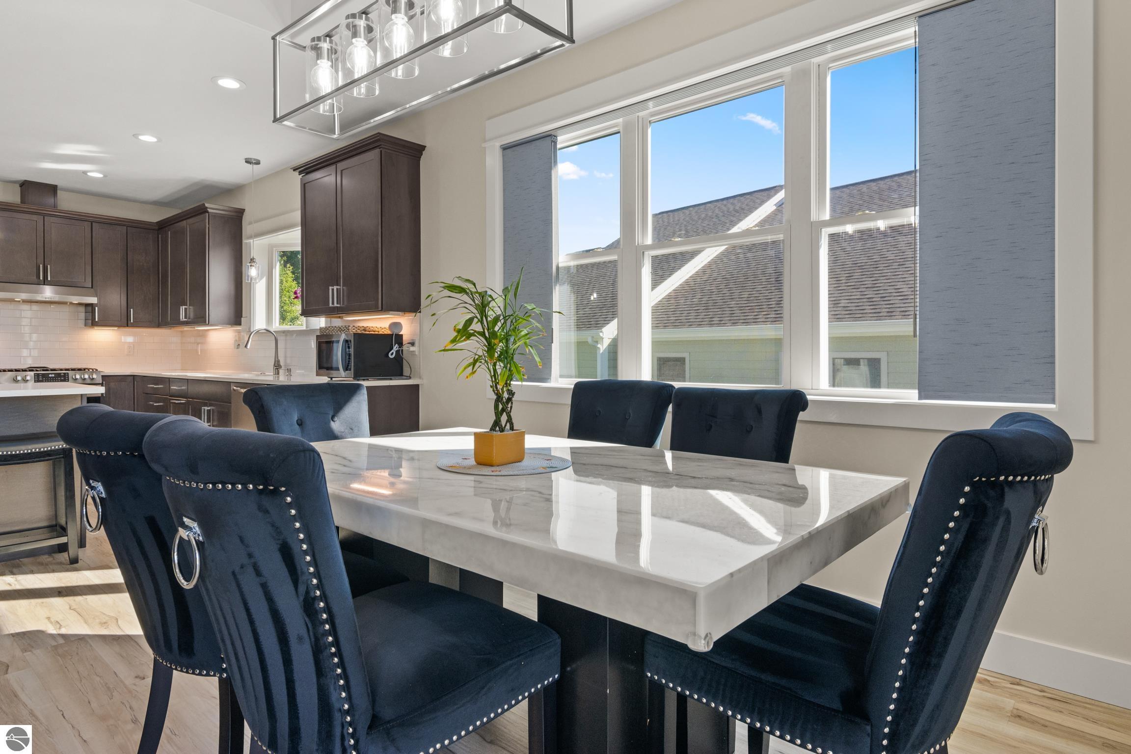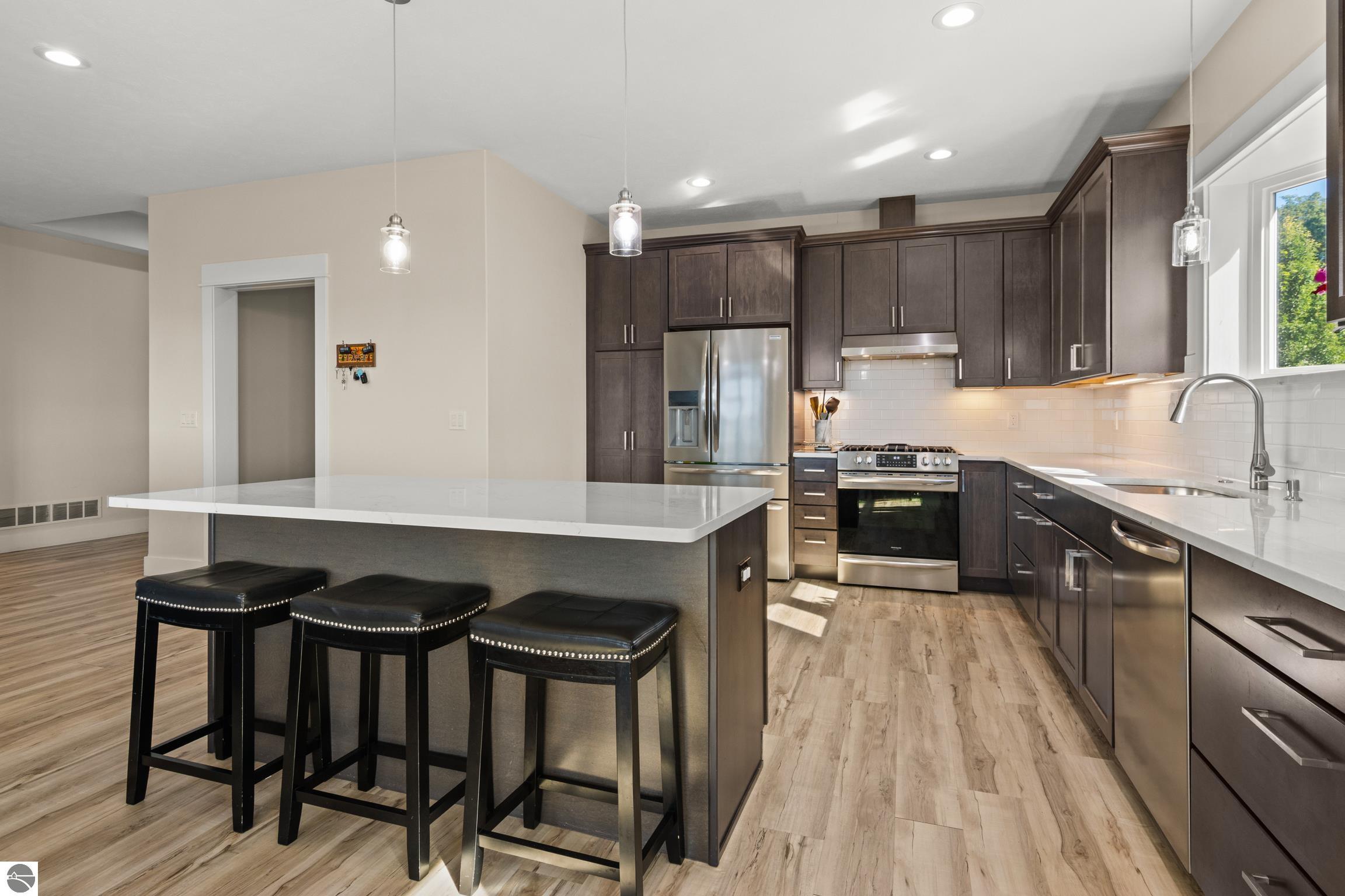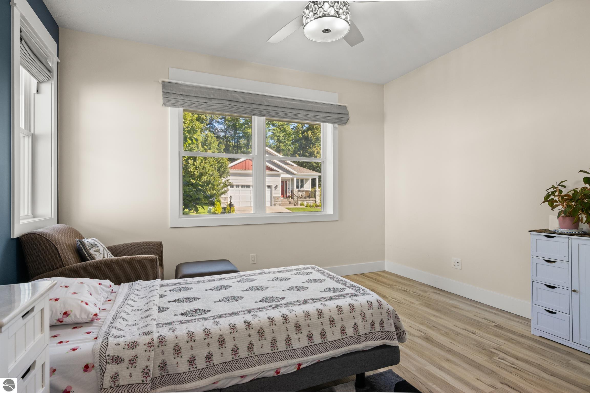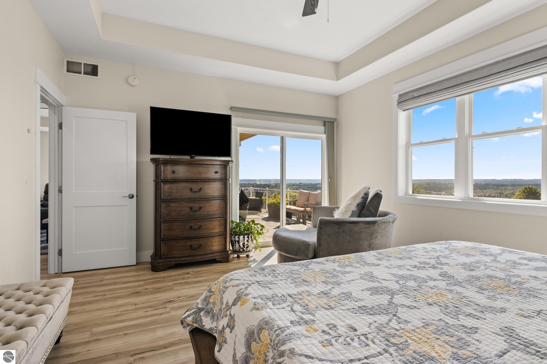 Welcome to Eagles View -- One of Traverse City's Premier Communities! This like-new, one-owner custom-built home offers the perfect blend of style, comfort, and functionality in one of Traverse City's most desirable developments. Its sweeping views make a stunning, picturesque backdrop. Thoughtfully designed with attention to detail throughout, this residence provides the ease of main-floor living in an open and inviting layout. The spacious primary suite features a private bath and a walk-in closet. The primary bedroom has a trayed ceiling to add to the luxurious look. The bright and modern kitchen is equipped with granite countertops, stainless steel appliances, a large island, a pantry, and extra shelving. The living and dining areas showcase a trayed ceiling, a stunning stone-surround gas fireplace, and double...yes, double sliding doors that open to a private rear patio -- perfect for relaxing or entertaining. Luxury vinyl plank flooring runs through the main living areas, and the home includes central air conditioning for year-round comfort. All of the bathrooms have tile flooring. The main floor also offers a convenient laundry room just off the attached two-car finished garage. The finished lower-level walk-out includes two additional bedrooms, a full bathroom, a spacious family room, a recreational area, and ample storage space. Professionally landscaped by Living Art Landscapes, the yard is equipped with irrigation and provides a serene outdoor oasis. This home is ideally located just minutes from downtown Traverse City, Munson Medical Center, shopping, schools, and numerous hiking and biking trails.