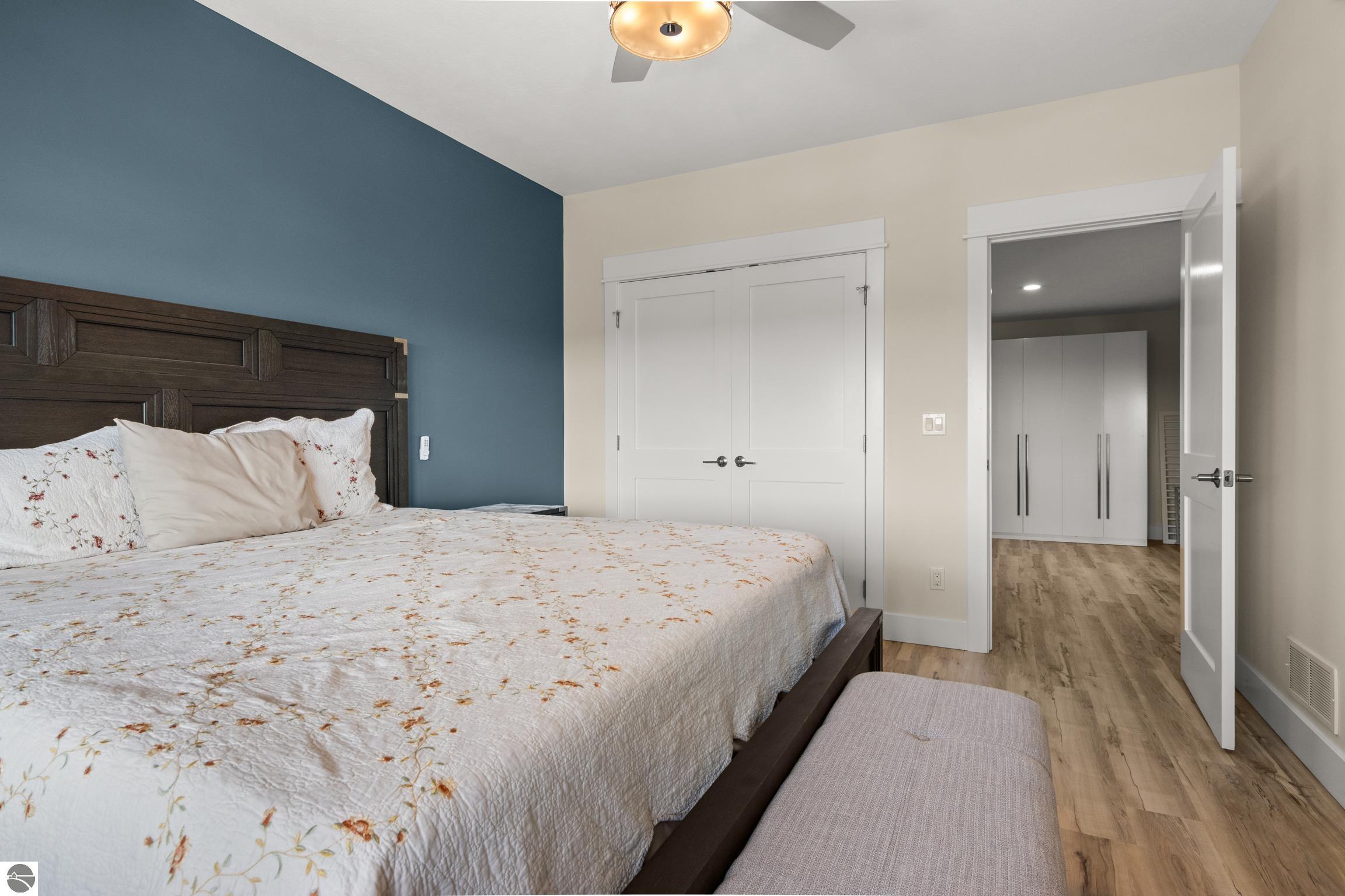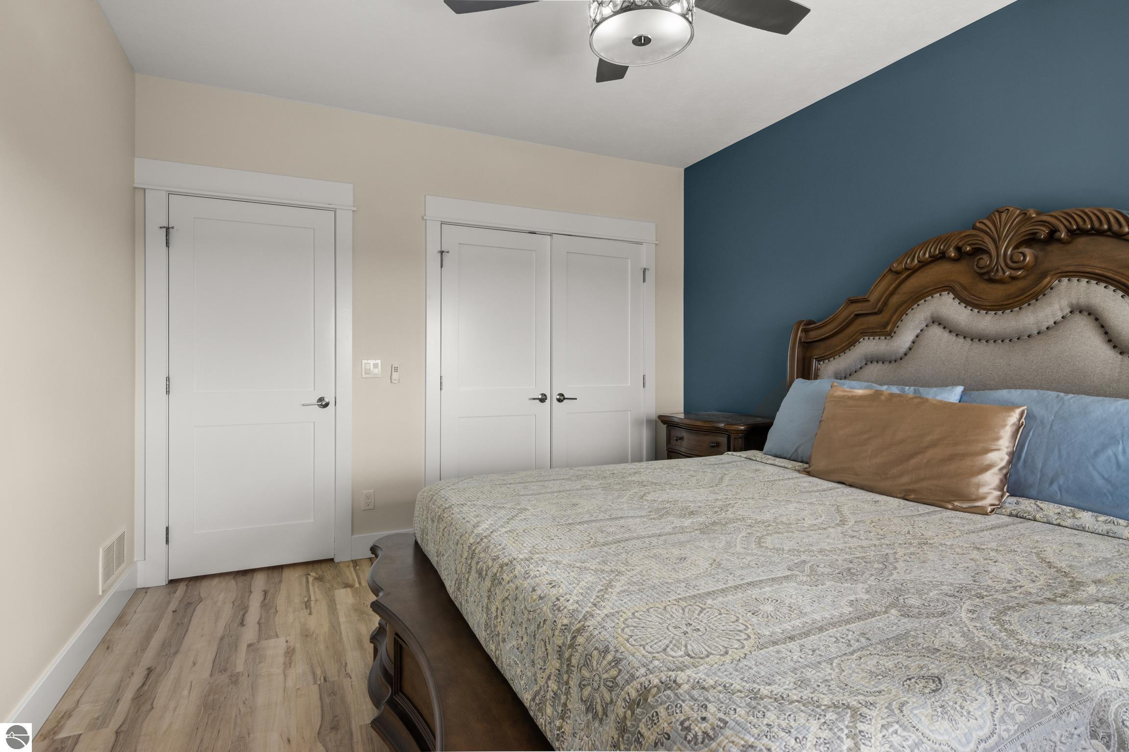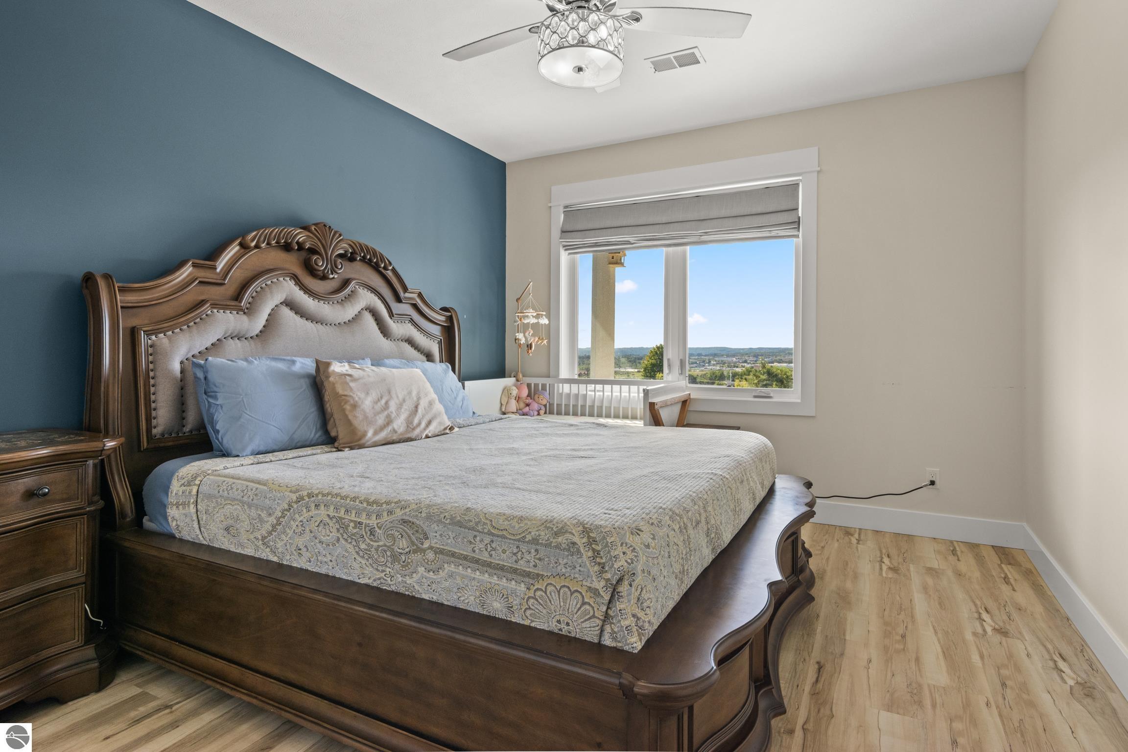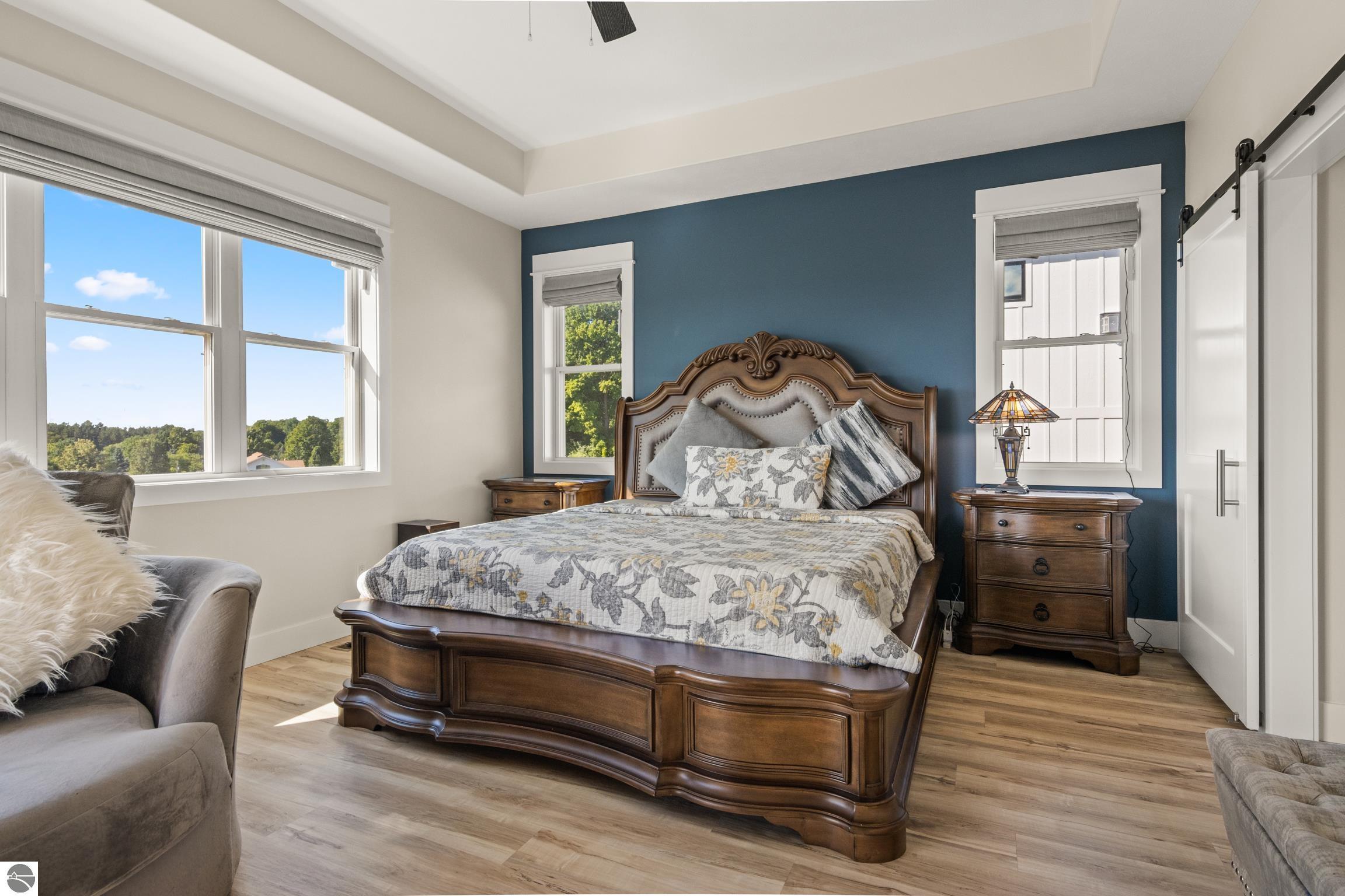 Welcome to Eagles View -- One of Traverse City's Premier Communities! This like-new, one-owner custom-built home offers the perfect blend of style, comfort, and functionality in one of Traverse City's most desirable developments. Its sweeping views make a stunning, picturesque backdrop. Thoughtfully designed with attention to detail throughout, this residence provides the ease of main-floor living in an open and inviting layout. The spacious primary suite features a private bath and a walk-in closet. The primary bedroom has a trayed ceiling to add to the luxurious look. The bright and modern kitchen is equipped with granite countertops, stainless steel appliances, a large island, a pantry, and extra shelving. The living and dining areas showcase a trayed ceiling, a stunning stone-surround gas fireplace, and double...yes, double sliding doors that open to a private rear patio -- perfect for relaxing or entertaining. Luxury vinyl plank flooring runs through the main living areas, and the home includes central air conditioning for year-round comfort. All of the bathrooms have tile flooring. The main floor also offers a convenient laundry room just off the attached two-car finished garage. The finished lower-level walk-out includes two additional bedrooms, a full bathroom, a spacious family room, a recreational area, and ample storage space. Professionally landscaped by Living Art Landscapes, the yard is equipped with irrigation and provides a serene outdoor oasis. This home is ideally located just minutes from downtown Traverse City, Munson Medical Center, shopping, schools, and numerous hiking and biking trails.