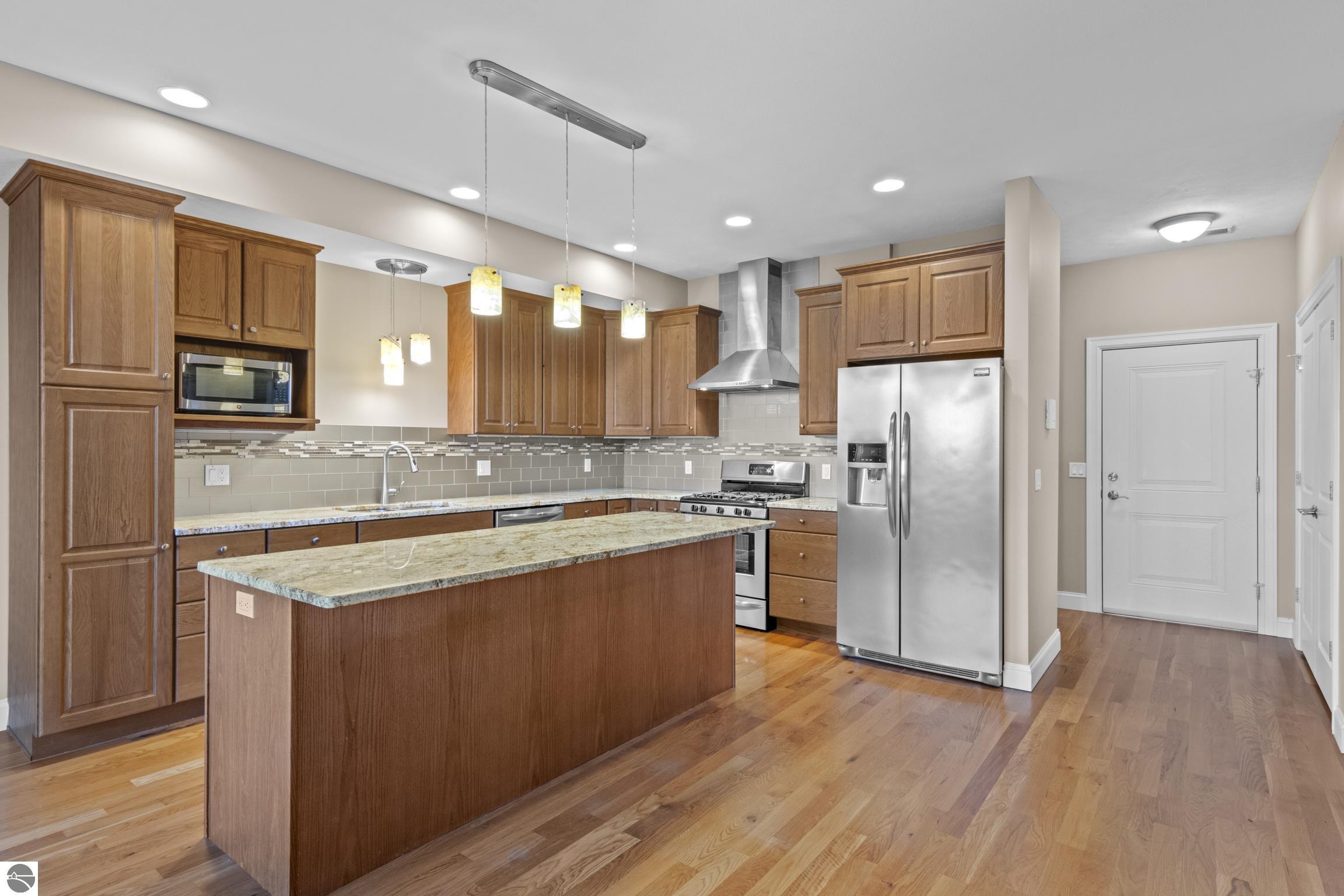 Spacious downtown two-bedroom, two-bath condo. This third-floor (elevator available) unit is a quick walk to everything downtown, with endless options for shopping, restaurants, and the TART trail. Beautiful granite countertops, tile backsplash, stainless steel appliances, high-end light fixtures, and energy-efficient windows are included. Hardwood floors are in the main living area, kitchen, foyer, utility room, and second bedroom. Closet space is abundant. An east-facing covered balcony is included. An Assigned parking space on the main level in the shared garage with a remote-controlled garage door, heated floors, and a storage unit. Secure entry to residences through two locked doors with a key fob. Garage is also locked and can only be accessed by a fob. Per the Condominium bylaws, "A maximum of two dogs that are older than four months old at any one time." Minimum of 6-month rental. Priced to sell! IMMEDIATE POSSESSION!