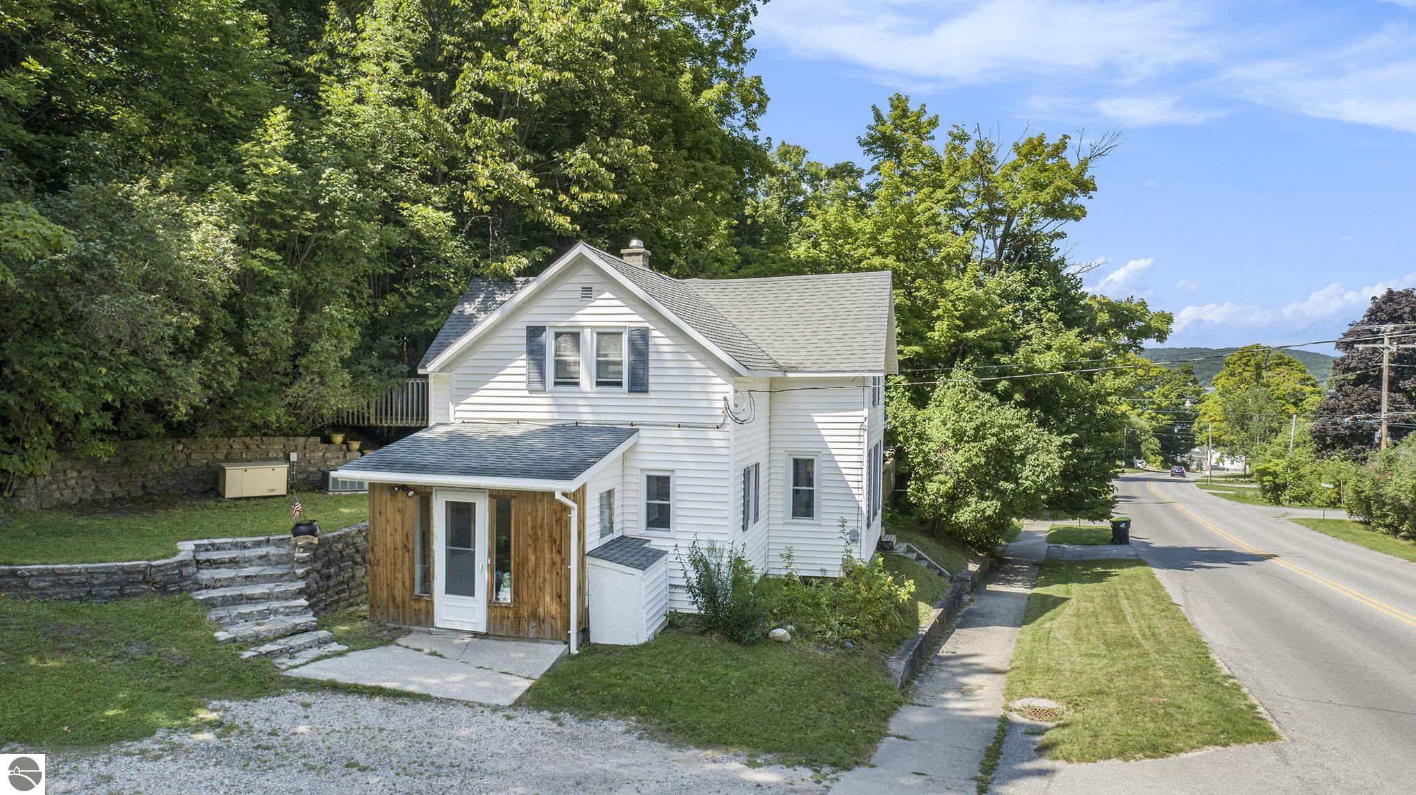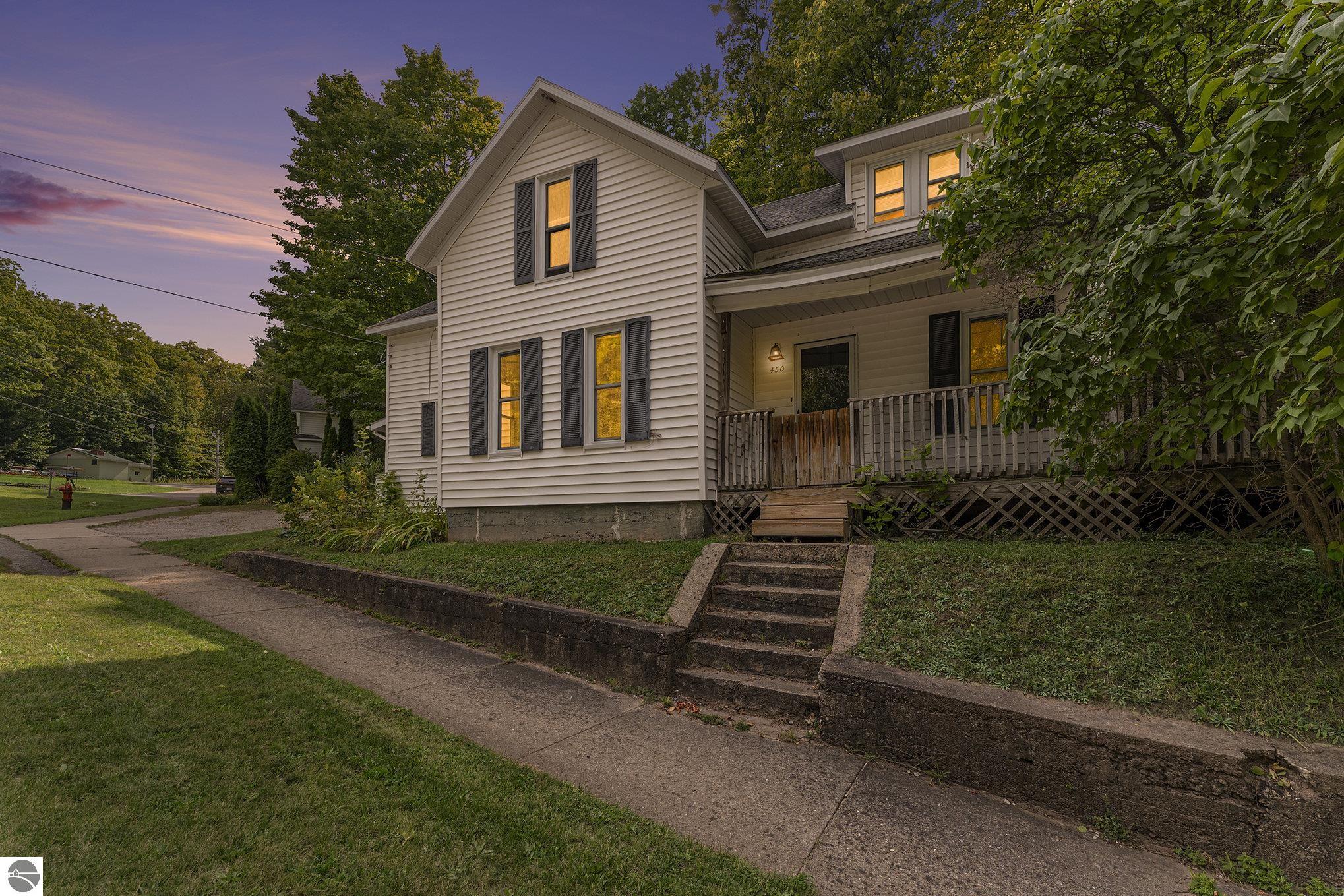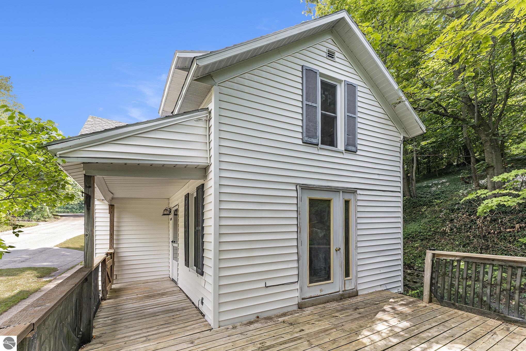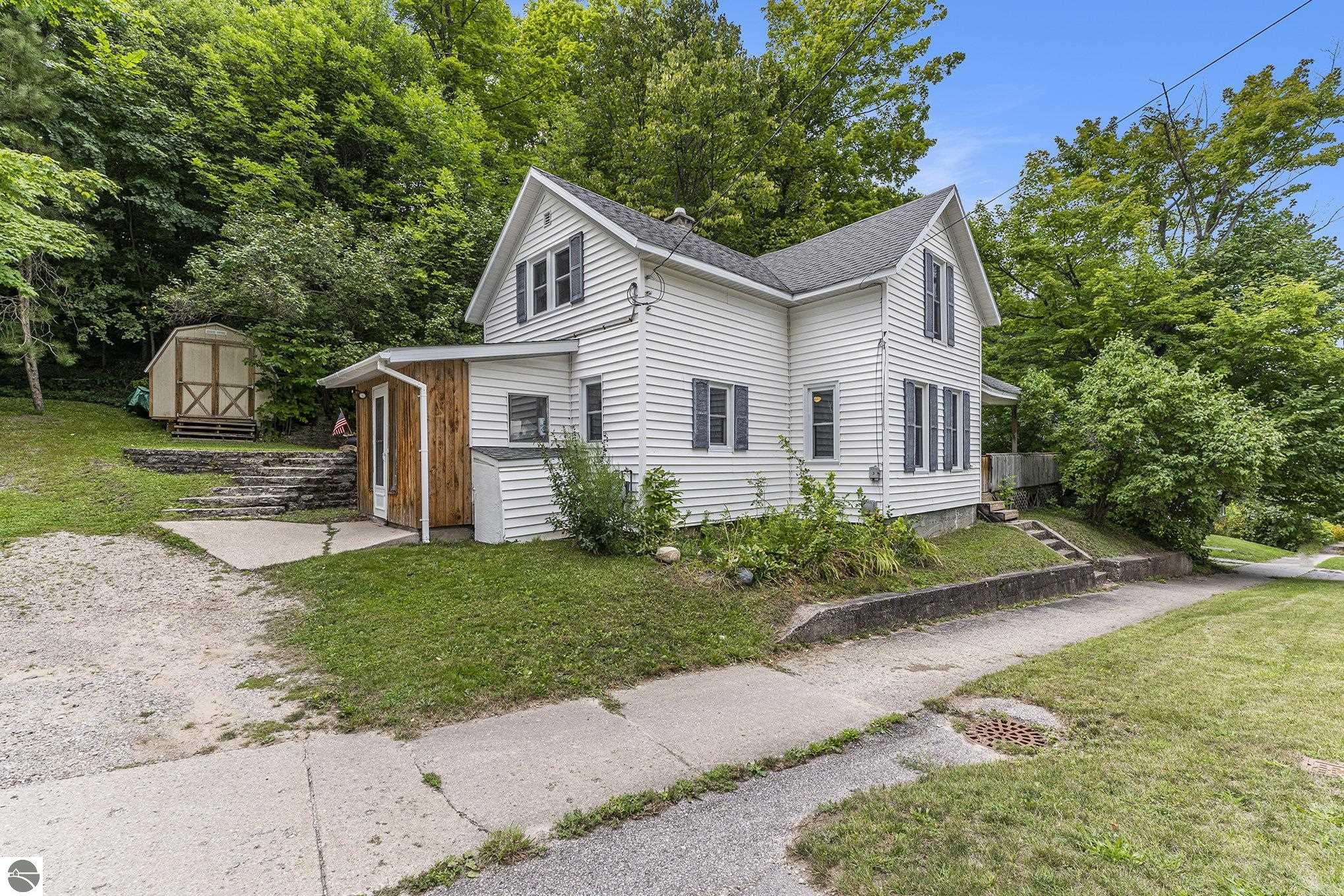 *Charming 2-Story Farmhouse in the Village of Beulah* Nestled on a scenic, wooded hillside covered in myrtle, this charming two-story farmhouse offers peaceful living with all the comforts. Featuring a 2-sided wrap-around deck, perfect for soaking in the beauty of Northern Michigan. Upon arrival, a unique and inviting entryway greets you. Step up into a cozy coat room, ideal for shedding shoes and outerwear, before entering a secondary coat room with additional storage. This functional layout leads seamlessly into the heart of the home: the kitchen. From there, it flows into a spacious dining room, perfect for gathering. Onward, you enter the living room which then extends to the deck. Convenience is key, as well as a sizeable main-floor laundry room that doubles as a full bathroom. Upstairs, you'll find three comfortable bedrooms and another full bath, ensuring plenty of space for everyone. A pantry under the stairs provides practical storage solutions, while a bonus storage shed outside offers extra room for outdoor gear. With municipal water and sewer, natural gas heating, and a public-maintained road, this home ensures ease of living year-round. The ample parking space is perfect for hosting visitors, while the tranquil hillside setting offers privacy and relaxation. This welcoming farmhouse is a true gem, right in the heart of town, offering both character and convenience in a picturesque location. SOLD "AS IS".
