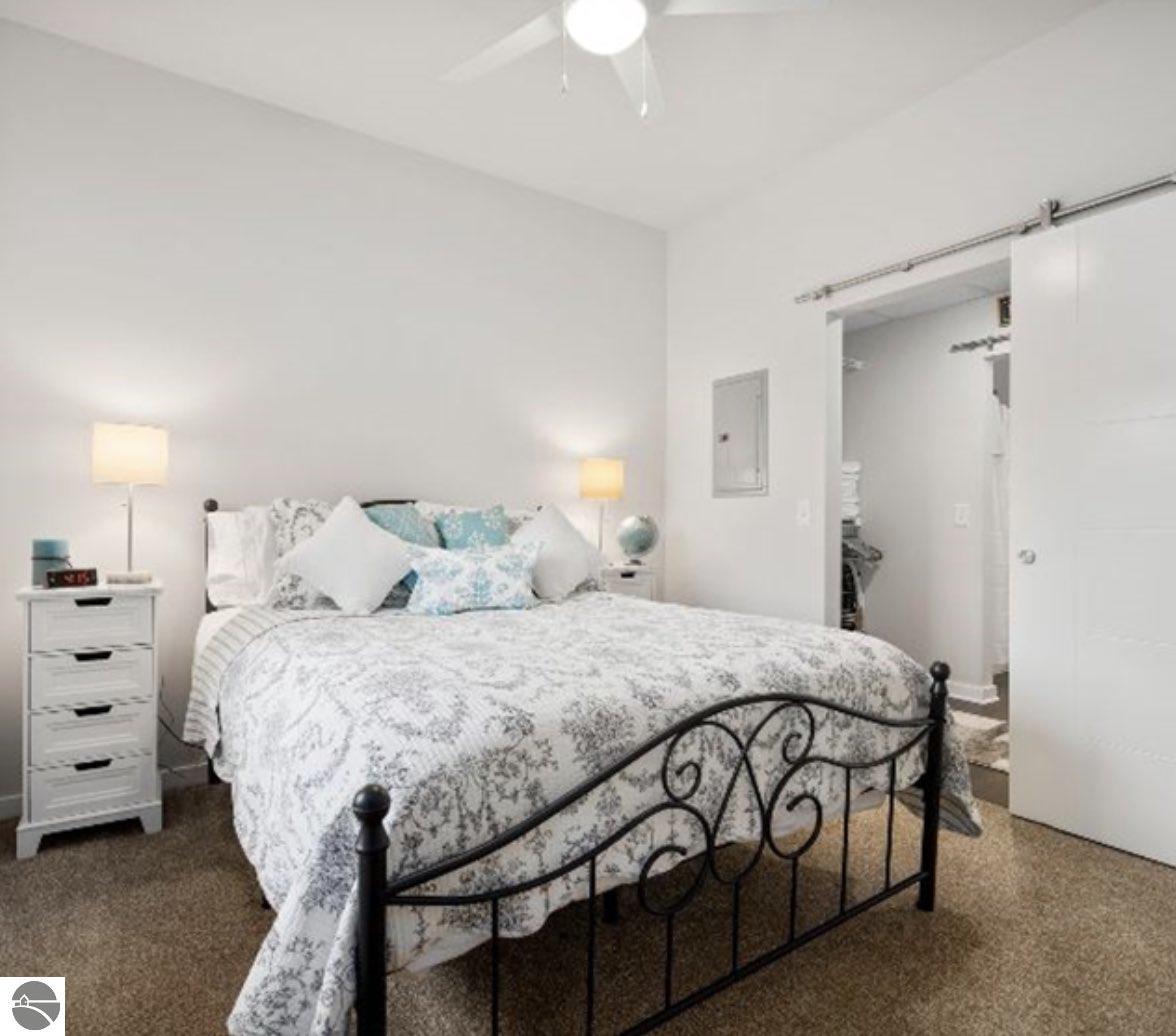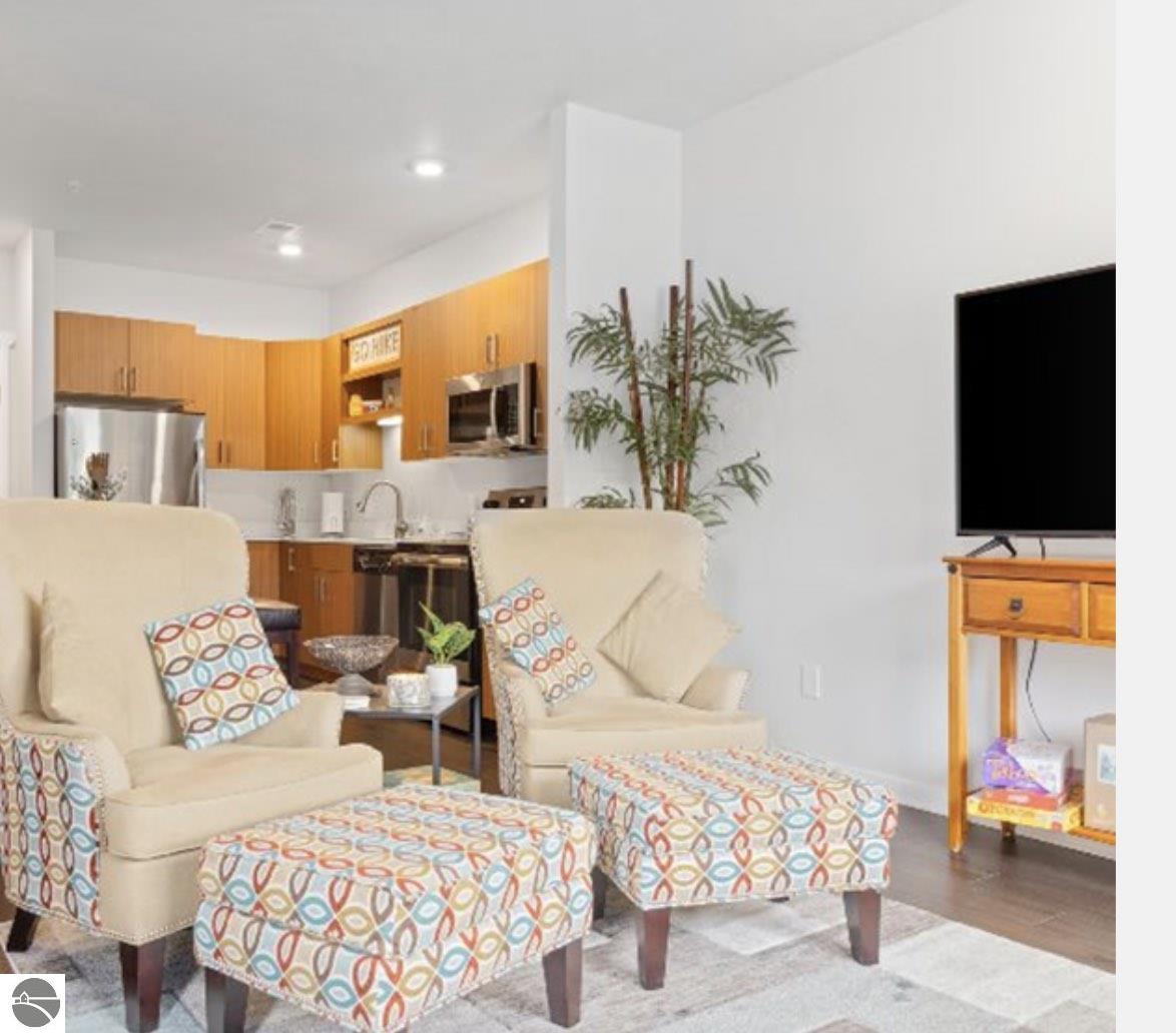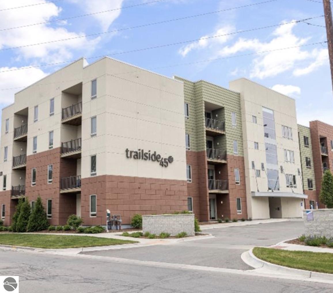 This modern 1B/1B residence comes fully furnished. Just bring your suitcase and linens. Located in Traverse City's downtown, Trailside 45 is a friendly and convenient condominium community. It's adjacent to the TART trail, which allows pedestrian and bicycle access. There is an oversized bike locker room located on each floor. This unit has quartz countertops in the kitchen and bath. Additional amenities include high-efficiency appliances, no steps, wide hallways, elevator access to the residence, a private covered balcony with westerly facing views, a washer/dryer, window coverings, and built-in closet organization. No smoking or fireworks are permitted. Two small to medium-sized dogs are okay upon approval--$ 250 Non-refundable pet fee per pet. No events, parties, or large gatherings are permitted. All utilities are included. Tenant will be billed. This unit is available month-to-month, or negotiable up to 3 months beginning Feb. 7th through May 29. Security deposit is $1,000. Limit 2 adults, each is required to do a Rentspree application.