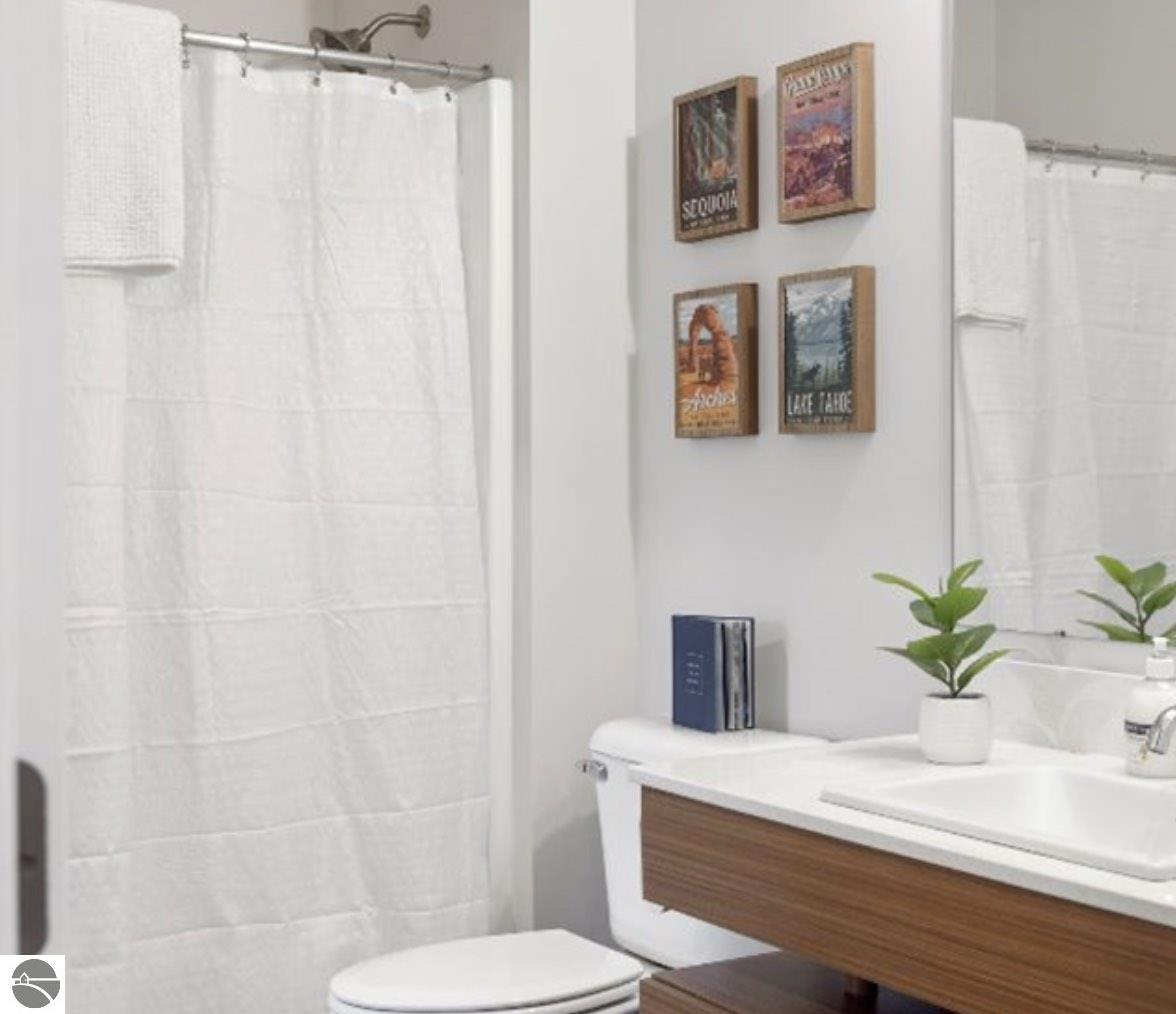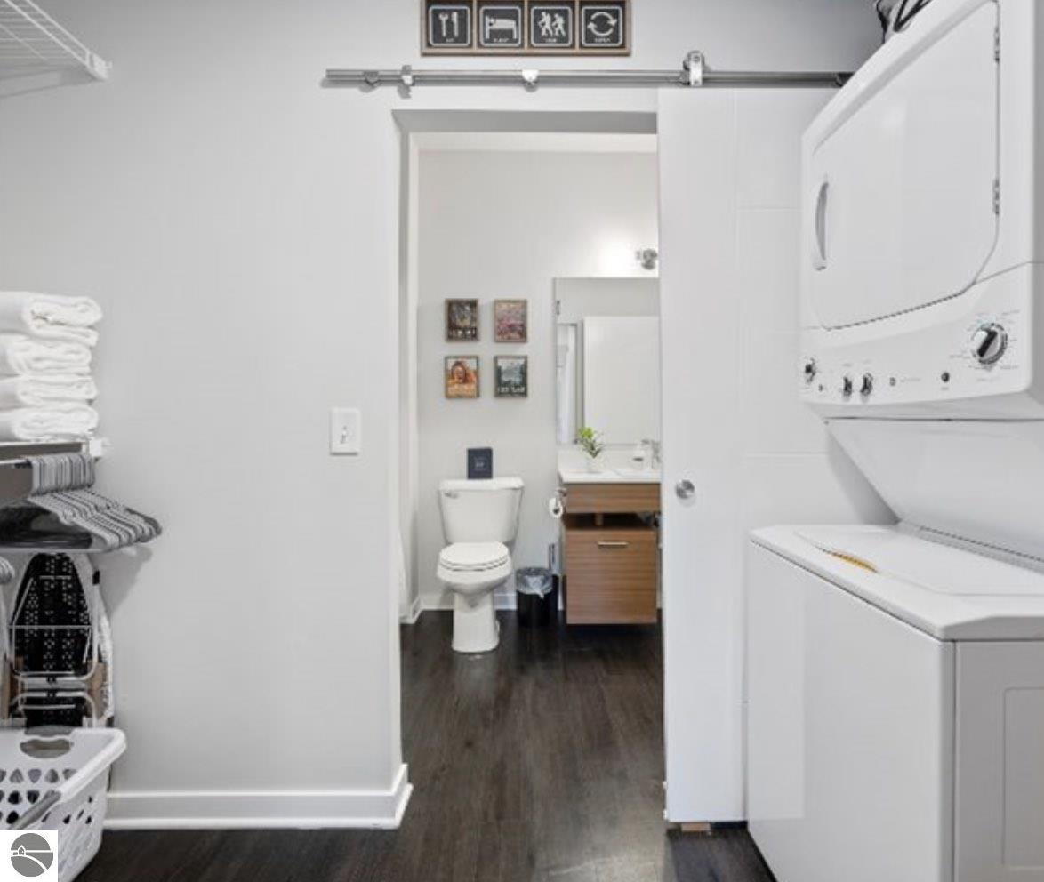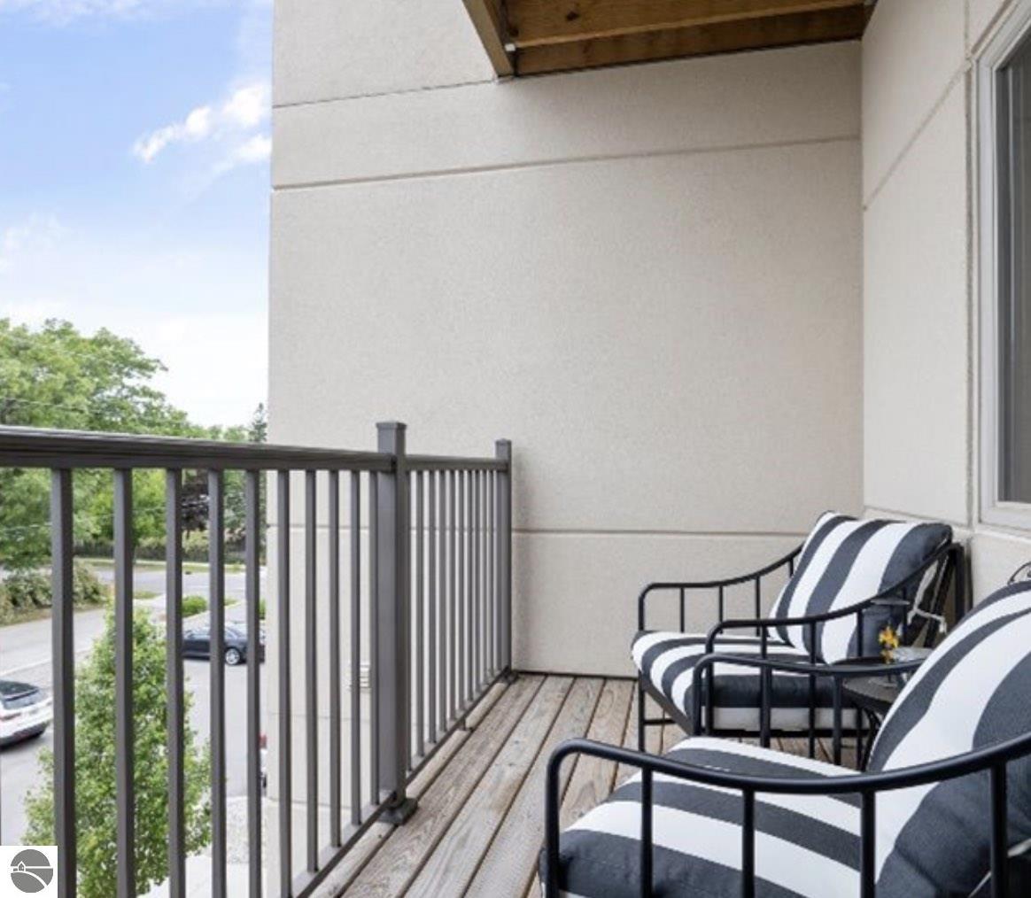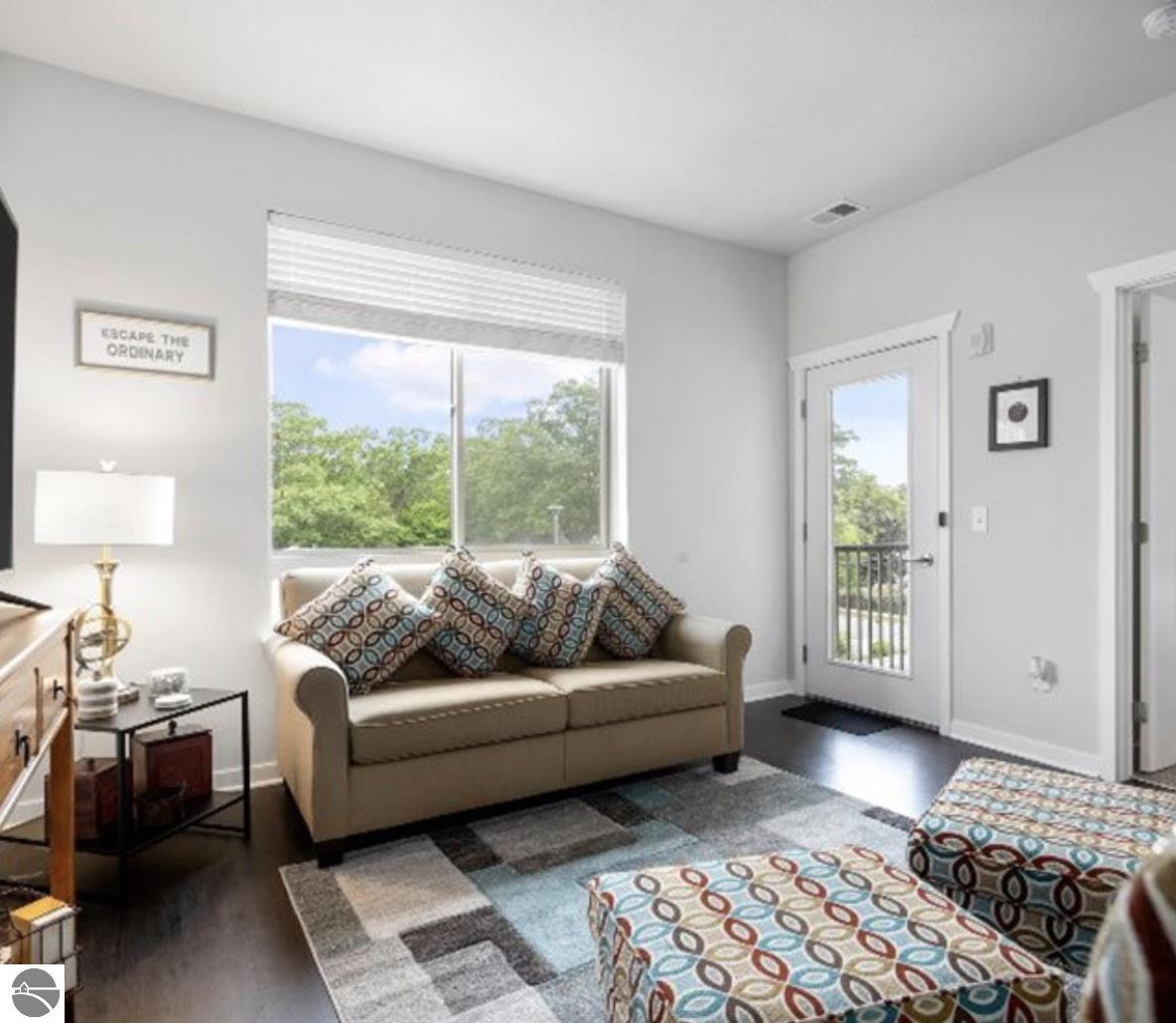 This modern 1B/1B residence comes fully furnished. Just bring your suitcase and linens. Located in Traverse City's downtown, Trailside 45 is a friendly and convenient condominium community. It's adjacent to the TART trail, which allows pedestrian and bicycle access. There is an oversized bike locker room located on each floor. This unit has quartz countertops in the kitchen and bath. Additional amenities include high-efficiency appliances, no steps, wide hallways, elevator access to the residence, a private covered balcony with westerly facing views, a washer/dryer, window coverings, and built-in closet organization. No smoking or fireworks are permitted. Two small to medium-sized dogs are okay upon approval--$ 250 Non-refundable pet fee per pet. No events, parties, or large gatherings are permitted. All utilities are included. Tenant will be billed. This unit is available month-to-month, or negotiable up to 3 months beginning Feb. 7th through May 29. Security deposit is $1,000. Limit 2 adults, each is required to do a Rentspree application.