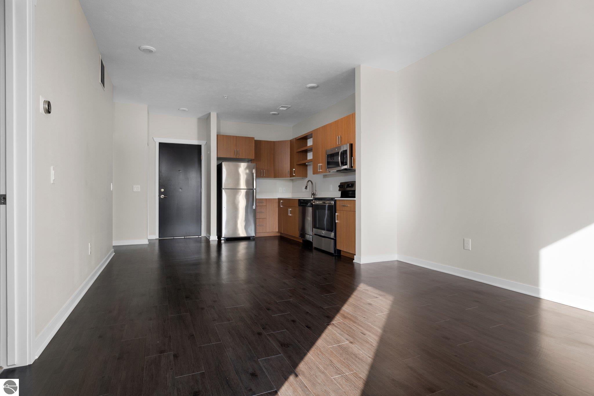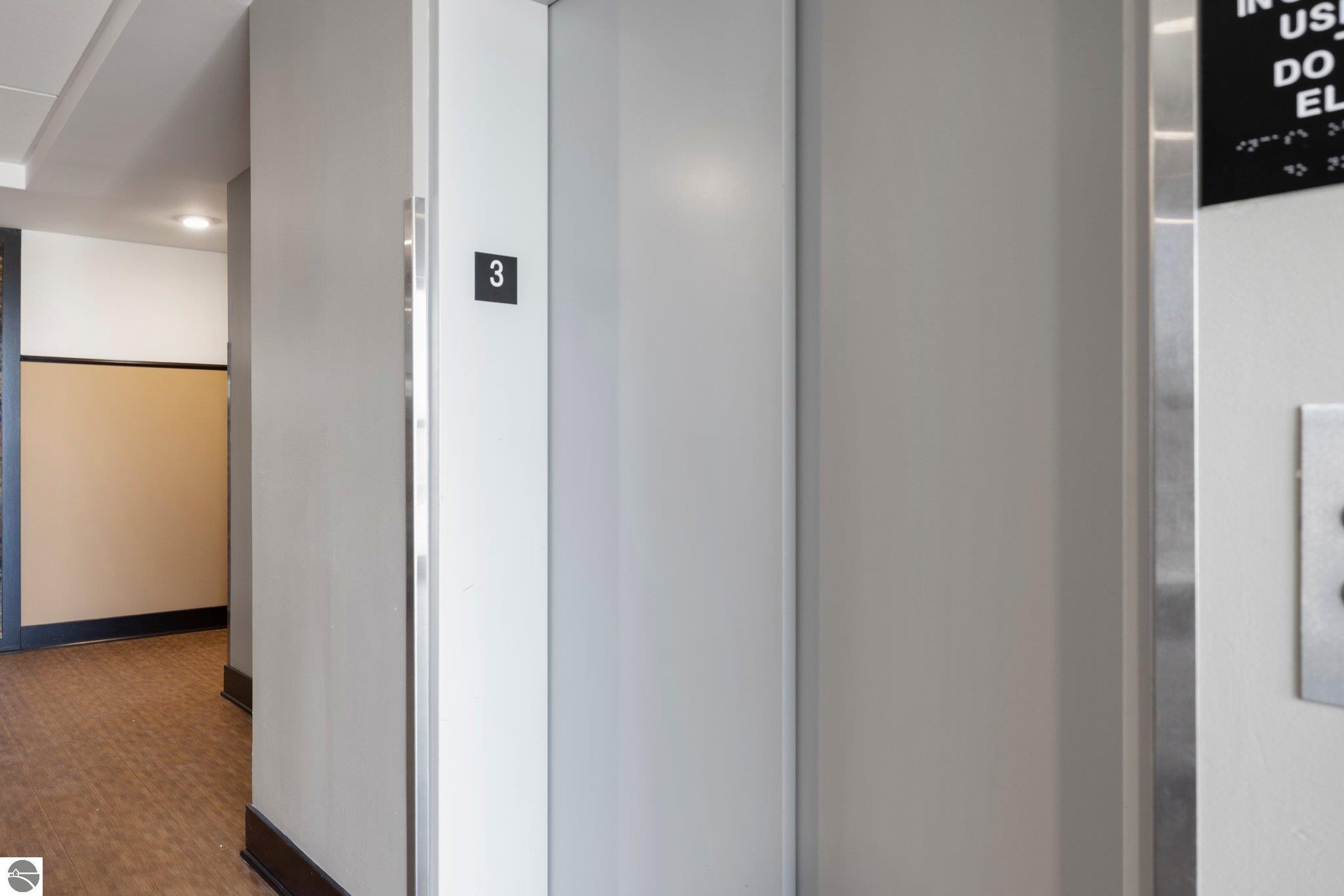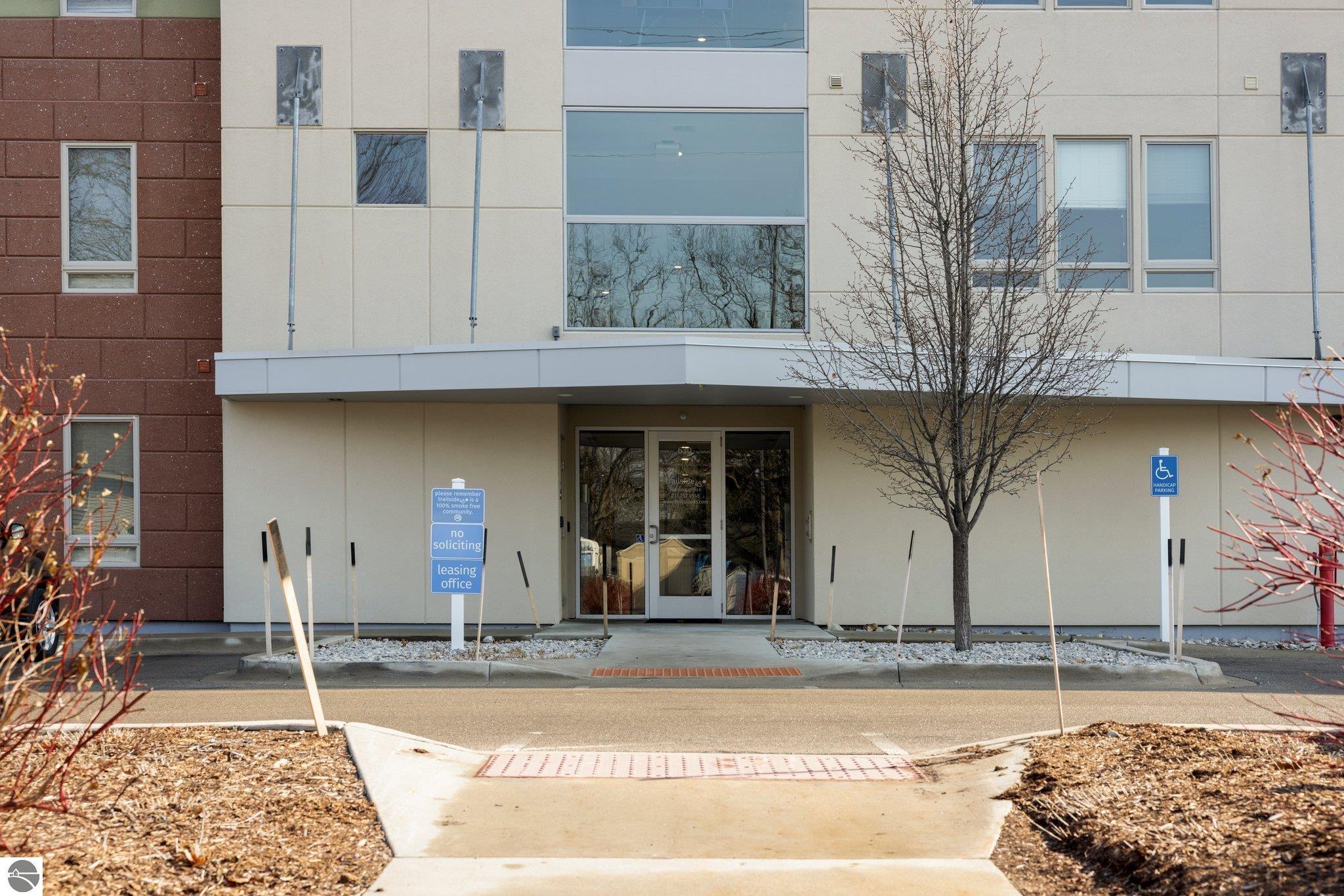 Take advantage of this excellent investment opportunity! The entire building is permitted for short-term rental, so there is no guessing about licensing. Located in Traverse City's downtown, Trailside 45 is a friendly and convenient condominium community. It's adjacent to the TART trail, which allows pedestrian and bicycle access. There is an oversized bike locker room located on each floor. There is also a shared space for larger gatherings. This unit has quartz countertops in the kitchen and bath. Additional amenities include high-efficiency appliances, forced air, central air, electric water heater, refrigerator/freezer, oven/range, disposal, dishwasher, microwave, washer, dryer, keyed entry, no steps, wide hallways, elevator access to the residence, a private covered balcony with westerly facing views, washer/dryer, window coverings, and built-in closet organization. Association dues are $350.00 monthly, including most utility costs, such as water/sewer, heat, trash removal, snow removal, cable TV, and cable internet. Fees include all exterior maintenance, snow removal, lawn care, landscaping, liability insurance, and fire insurance. Electricity is through the City of Traverse City. It usually costs $35-41 per month, depending on usage. Per HOA, pets are permitted--a maximum of up to two medium-sized dogs. Try easy living with no outdoor maintenance (but the balcony is lovely to enjoy). The elevator makes top-floor living a breeze!